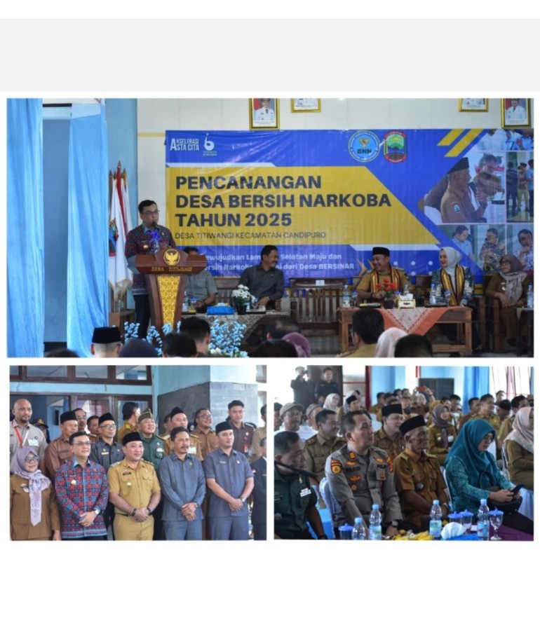 Lampung Selatan,baranewsjabar.com | 27 Mei 2025 – Dalam upaya serius memerangi penyalahgunaan dan peredaran gelap narkoba, Pemerintah Kabupaten Lampung Selatan melalui Wakil Bupati Saiful Anwar secara resmi mencanangkan Desa Bersinar (Bersih Narkoba) di Balai Desa Titiwangi, Kecamatan Candipuro. Kegiatan ini turut disaksikan dan didampingi oleh Kepala Badan Narkotika Nasional Kabupaten (BNNK) Lampung Selatan, AKBP Rahmad Hidayat, S.E., M.M.