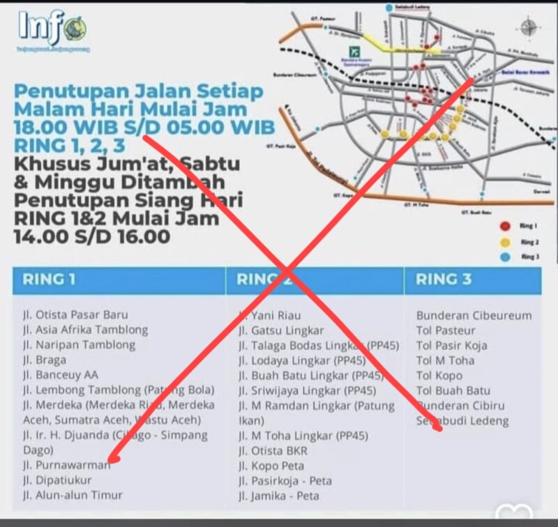 Bandung, baranewsjabar.com- Baru-baru ini beredar informasi di media sosial yang menyebutkan adanya penutupan jalan besar-besaran di Kota Bandung. Mulai dari kawasan Ring 1 – Ring 3 seperti jalan protokol, Jalan Asia Afrika, Jalan Riau, dan jalan lainnya di Kota Bandung hingga pintu tol.