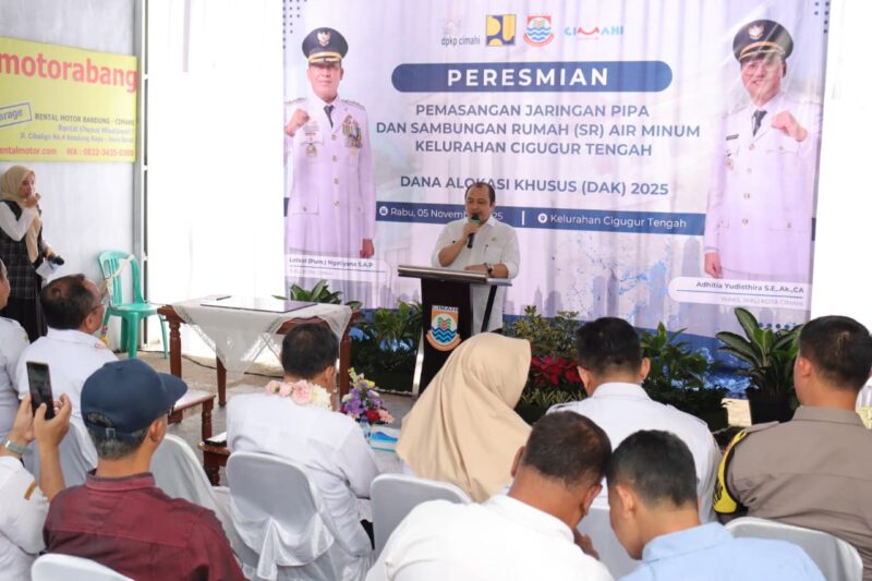 CIMAHI Pemerintah Kota Cimahi meresmikan Pemasangan Jaringan Pipa dan Sambungan Rumah (SR) Sistem Penyediaan Air Minum (SPAM) di Kelurahan Cigugur Tengah, Kecamatan Cimahi Tengah, Rabu (5/11). Peresmian dipimpin langsung oleh Wali Kota Cimahi, Ngatiyana, dan turut dihadiri unsur dari Kejaksaan Negeri dan Polres Kota Cimahi, perangkat daerah, camat, lurah, serta tokoh masyarakat setempat.