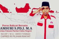 Jakarta — Ketua Umum Partai Cinta Negeri (Samsuri, S.Pd.I., M.A.) dideklarasikan sebagai Calon Presiden Republik Indonesia untuk Pemilihan Presiden (Pilpres) 2029 oleh Dewan Pimpinan…